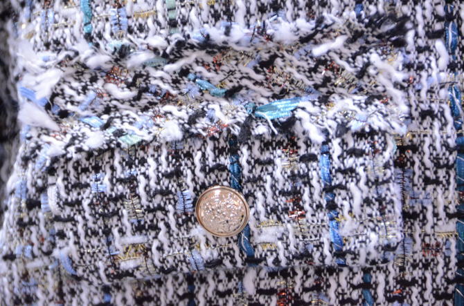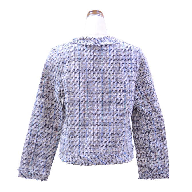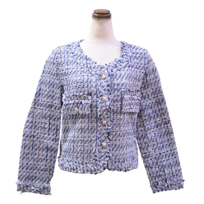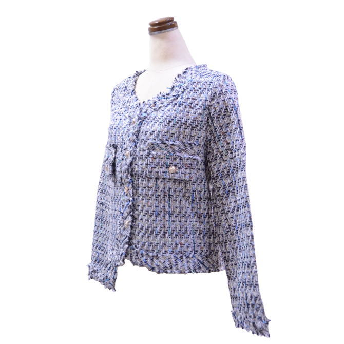 高級感の有るツイード生地が華やかな印象を醸し出します♪ ネックラインをすっきりと女性らしく魅せるノ-カラ-。 しわになり難い素材なので、腕にかけて持ち運んでも大丈夫♪ 程よい丈感はデニムやワンピースなどのカジュアルスタイルにも好相性♪ 上品な印象のジャケットは、卒入学式や披露宴や会食などのオケージョンシーンで大活躍◎